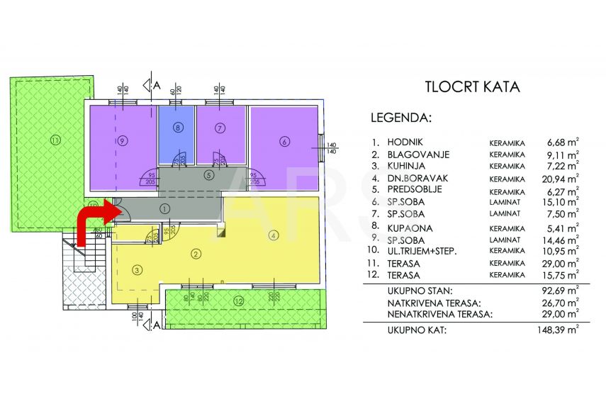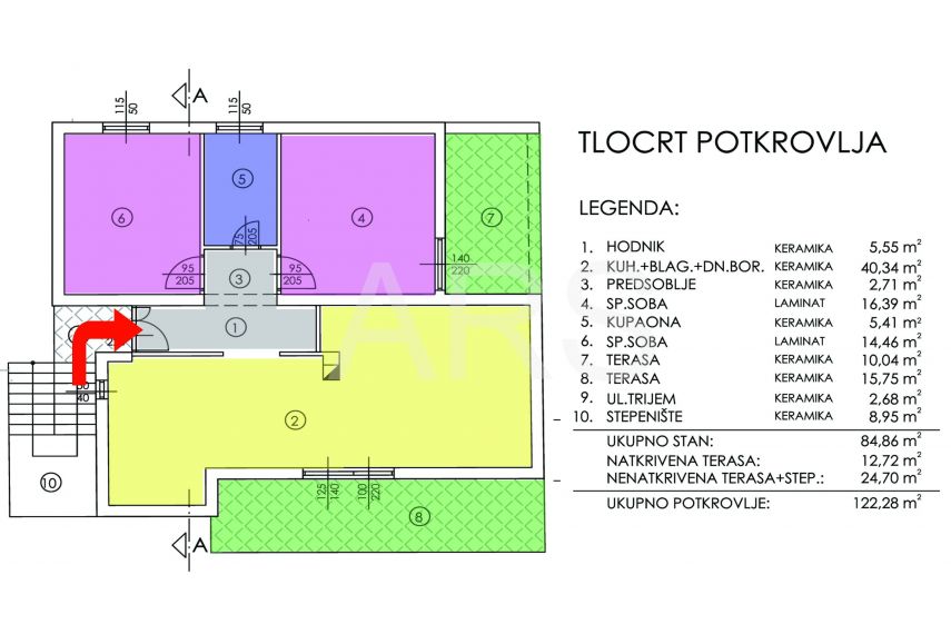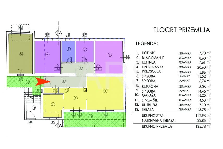 Stanovi u prizemlju (108 m2) i katu (108 m2) imaju 3 spavaće sobe, kupaonu, dnevni boravak, blagovaonu i kuhinju sa spremištem.